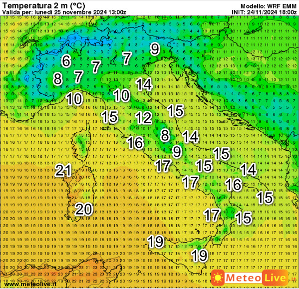 Sul fronte termico, queste sono le temperature attese in Italia alle ore 14 della giornata odierna, lunedi 25 novembre: