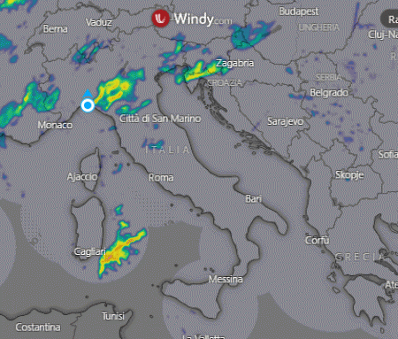 Piogge intense e temporali sono in atto tra la Liguria centro-orientale ed alcune aree del nord-est. Qualche rovescio anche nelle aree interne del centro e poco ad est della Sardegna, per il resto il tempo è asciutto.