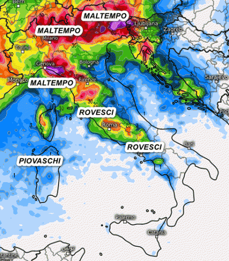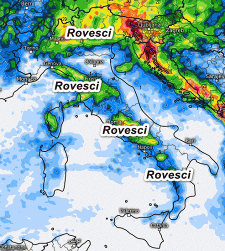 Maltempo con piogge anche intense su alta Lombardia, Triveneto e Liguria centro-orientale; in queste aree saranno possibili anche nubifragi. Più sporadiche le precipitazioni in pianura con anche lunghi momenti asciutti. Rovesci anche lungo l’alto e il medio Tirreno e nelle aree interne; piovaschi anche in Sardegna, per il resto tempo asciutto.