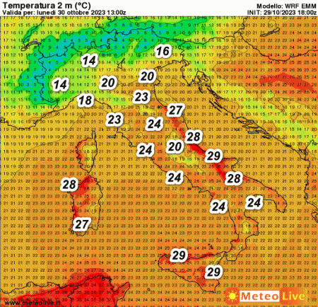 Fanno davvero sensazione i 29° della Sicilia e del Foggiano, così come i 28° della Puglia e della Sardegna settentrionale. Più fresco al nord-ovest dove non si supereranno i 15°