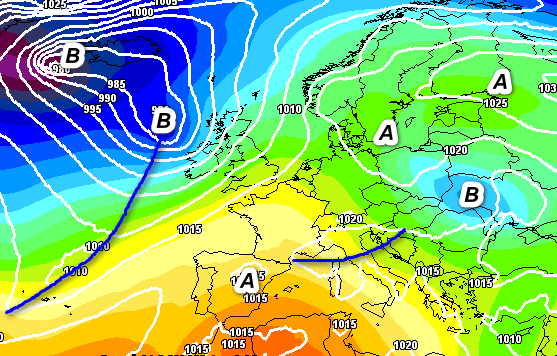 La prima mappa mostra la situazione sinottica attesa in Italia nelle ore centrali di lunedi 18 marzo: