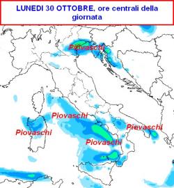 Ecco il quadro delle precipitazioni attese per le ore centrali di lunedì 30 ottobre (prima mappa); oltre all’atteso calo delle temperature che sarà più avvertito al nord, nelle zone interne del centro e lungo il versante adriatico, subentreranno anche alcuni rovesci seppur locali e mal organizzati.