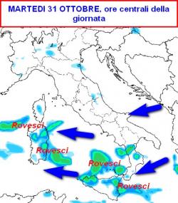 Nella giornata di martedì 31 ottobre i rovesci si concentreranno sulle due Isole Maggiori e sulla Calabria, dove potrebbero assumere anche carattere temporalesco.