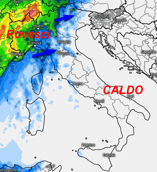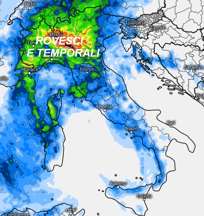 Rovesci anche su Toscana, Sardegna, fino a raggiungere la Campania e forse la Sicilia settentrionale in serata, con sensibile calo delle temperature. Sul resto del meridione e sul basso Adriatico ancora tempo soleggiato, ma con temperature in calo.