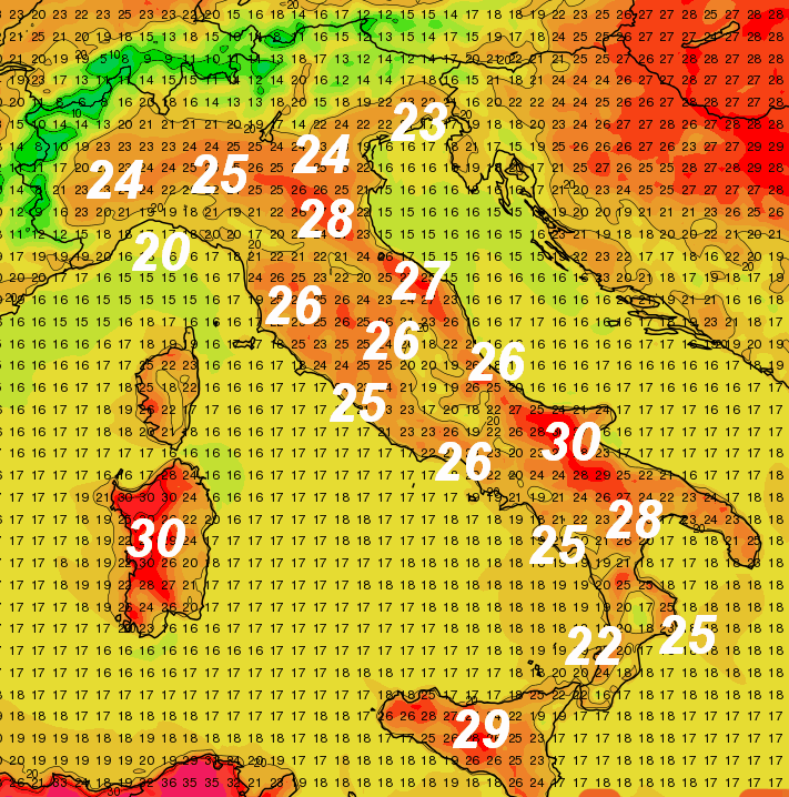 Ancora punte di 30° sulla Sardegna e sulla Puglia, ma molte aree della nostra Penisola avranno temperature attorno a 26-28°, molto superiori alle medie del periodo.