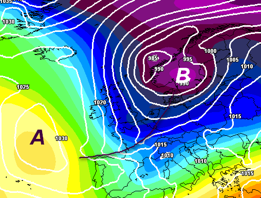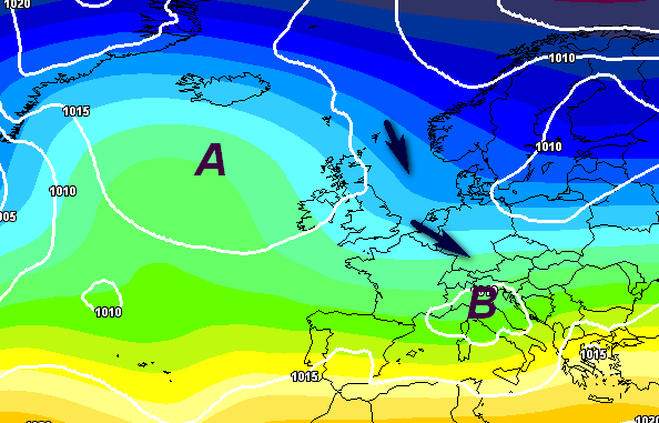Da quella situazione però si dovrebbe passare presto (entro il 10 gennaio) a quella che vi mostriamo qui sotto, che invece rimane lo schema barico più difficile che possa materializzarsi (e dunque ha un’attendibilità molto bassa al momento), cioè lo scambio meridiano di calore tra masse d’aria: