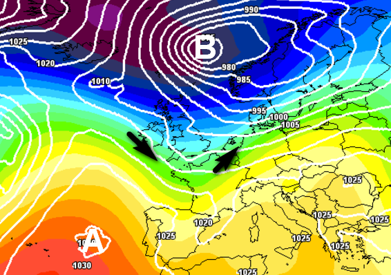 Primo punto: le perturbazioni atlantiche in arrivo da ovest durante questi ultimi giorni di novembre riusciranno parzialmente a sfondare verso sud, portando qualche precipitazione al nord e su parte del centro. Certo, non farà molto freddo, ma è già un segnale di scarso dominio anticiclonico, lo si evince da questa mappa: