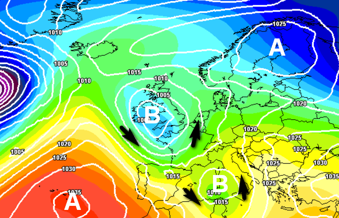 Secondo punto: ancora più importante quanto si evince osservando l’evoluzione per la prima decade di dicembre, che mette in evidenza la formazione dell’anticiclone russo-scandinavo, chiaro segnale della presenza di aria fredda sull’est europeo e induce maggiormente le perturbazioni a puntare verso sud, cioè verso il Mediterraneo, come si vede in questa carta prevista per il 4 dicembre: