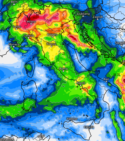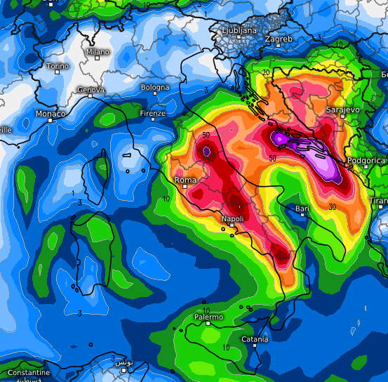 Chiaro che se si imponesse la tesi del modello ECMWF entro giovedì 14 novembre si verificherebbero abbondanti precipitazioni al nord e su parte delle regioni tirreniche, come si vede da questa mappa (in rosso gli accumuli anche prossimi o superiori ai 50mm in sole 24 ore).