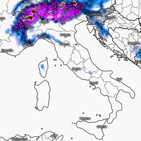 Copiose nevicate coinvolgerebbero molte valli dell’arco alpino sin verso gli 800-1000m, come si vede da questa mappa, con picchi anche oltre i 30cm oltre i 1500m: