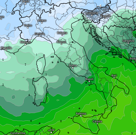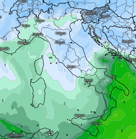 E con quali temperature a 1500m? Con quelle che vi mostriamo qui sotto, con valori tra -1 e -2°C il limite della neve medio sulle Alpi e sul nord Appennino è quello prospettato sopra, chiaro che in caso di precipitazioni più intense i fiocchi potrebbero spingersi sin sotto gli 800m nelle vallate superiori e più strette delle zone alpine: