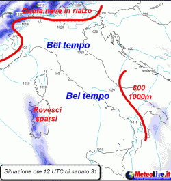 OGGI: nevicate lungo la cresta delle Alpi a quote che dai 500-600 metri della mattinata, si alzerà progressivamente fino a i 1300-1500 metri del pomeriggio-sera. Sempre in mattinata qualche nota di instabilità su medio-basso Adriatico e Sardegna con eventuali deboli rovesci, nevosi in Appennino e sul Gargano tra 800 e 1000 metri. Altrove bel tempo, con qualche velatura in transito al nord-est. Temperature in incipiente rialzo sulle Alpi.