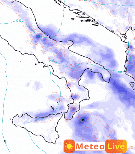 SITUAZIONE: il canale depressionario presente sull’Italia produce ancora i suoi effetti sulle nostre regioni meridionali, mentre altrove si vanno affermando schiarite sempre più ampie. Soprattutto su Molise, Calabria, Puglia, est Sicilia e Lucania saranno ancora possibili sino al pomeriggio piogge, rovesci e locali temporali, con tendenza a miglioramento in serata. Qui la mappa del nostro modello con i fenomeni previsti sino al pomeriggio odierno, guarda: