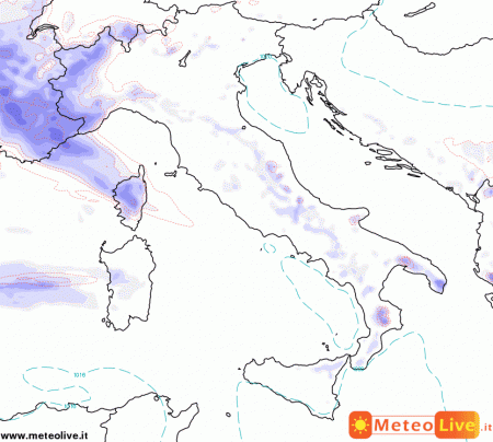 EVOLUZIONE: martedì un’altra perturbazione proverà a spingersi da ovest verso l’Italia ma il rialzo della pressione atmosferica previsto inibirà i fenomeni circoscrivendoli all’estremo settore nord-occidentale, come si nota dalla mappa qui sotto riferita al nostro modello e prevista per il pomeriggio di martedì 16 aprile: