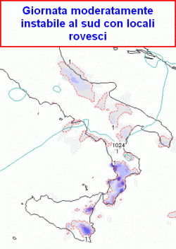 SITUAZIONE: un’ansa depressionaria si inserisce sul meridione d’Italia determinando condizioni di instabilità con possibili rovesci o brevi temporali, sul resto d’Italia una modesta nuvolaglia transiterà senza determinare alcuna conseguenza in un contesto mite, grazie alla protezione dell’anticiclone.