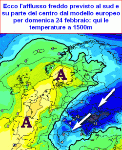 FREDDO e NEVICATE: Le nevicate, generalmente deboli, potranno interessare il meridione fra sabato e domenica 24 febbraio. Le temperature risulteranno in calo repentino, inferiori allo zero già dalle quote collinari e prossime allo zero anche in prossimità di alcune zone costiere adriatiche. Isolati rovesci di neve potrebbero raggiungere almeno in parte le zone pianeggianti. La previsione è però ancora da affinare. Alcuni modelli infatti si mostrano scettici sulla vera entità di questa irruzione fredda, limitandola al più alle regioni joniche e all’Egeo. Seguite gli aggiornamenti.