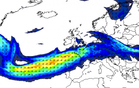 L’indebolimento dell’anticiclone si nota anche nella mappa seguente, dove si vede finalmente la corrente a getto (fiume d’aria che passa 10km sopra le nostre teste) ormai appoggiata al settore alpino, una gran bella notizia anche questa, l’autunno è davvero più vicino, perchè ogni stagione signori, deve fare il suo corso; il pensare di vivere un’eterna estate solo per soddisfare la nostra voglia di vacanze o per finanziare il turismo, si scontra con una realtà ambientale preoccupante, fatta ormai di troppo sole e troppo caldo: