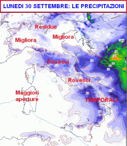 Oggi saranno ancora possibili rovesci o temporali specie al centro-sud. Un miglioramento è atteso al nord-ovest. Domani ancora qualche rovescio sul medio Adriatico e al sud, migliora sul resto della penisola. Mercoledì bel tempo, ma con aria più fresca da est su Adriatico e meridione.
