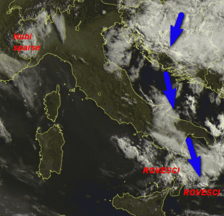 L’afflusso fresco settentrionale che ci ha interessato nei giorni scorsi tende lentamente a spostarsi verso levante. Questa mattina l’immagine satellitare nel campo del visibile mostra addensamenti all’estremo sud dove è presente anche qualche rovescio: