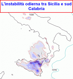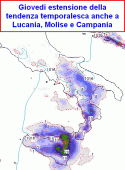 EVOLUZIONE: la goccia fredda estenderà temporaneamente la sua influenza al resto del sud e marginalmente a Lazio ed Abruzzo tra giovedì e venerdì, determinando un’accentuazione della tendenza temporalesca, che coinvolgerà principalmente Sicilia, Calabria, Molise, Lucania e Campania e in parte Puglia, Pontino, Pescarese e Chietino.