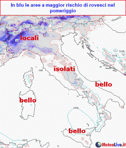 DOMANI: al nord tempo instabile con formazione di nuclei temporaleschi a carattere sparso, più probabili lungo una linea: basso Piemonte, bassa Lombardia, Emilia, basso Veneto, basso Friuli, Venezia Giulia. Anche al centro e sulla Sardegna nuvolosità variabile, a tratti intensa, con rovesci sparsi, anche a sfondo temporalesco. Al sud parzialmente nuvoloso con ampie schiarite ma anche isolati rovesci in Appennino nel pomeriggio e con tendenza ad ulteriore aumento della nuvolosità. Temperature in diminuzione, specie al nord.