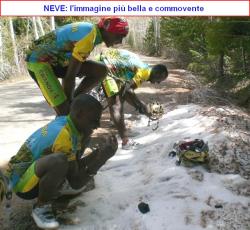FOTO del GIORNO: la grande gioia di poter vedere la neve per la prima volta dal vero. Molti qui in Italia purtroppo non hanno un feeling con la neve e non comprendono la grandezza del fenomeno, tale da far fermare i ciclisti ruandesi in allenamento nello Utah. Un mucchietto di neve sporca a bordo strada è bastato per colpirli in modo così intenso da fargli sospendere l’allenamento e ad inchinarsi di fronte alla suggestione soprannaturale del bianco. Riflettete!
