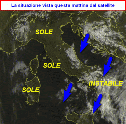 L’immagine satellitare di questa mattina testimonia il previsto miglioramento su gran parte della Penisola, ma tradisce anche una certa instabilità che interessa ancora il nostro meridione.