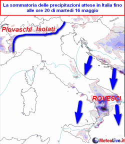 La mappa previsionale per la giornata odierna, martedì 16 maggio, è relativamente semplice. Quella che vedete è la sommatoria delle precipitazioni attese in Italia fino alle ore 20 di oggi.