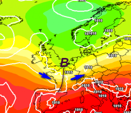 Entro giovedì sera 20 luglio è prevista una graduale cessione del campo di alta pressione al nord, a partire dall’arco alpino, grazie all’inserimento di correnti meno calde di origine atlantica (da ovest) con i primi forti temporali, lo vediamo da questa mappa: