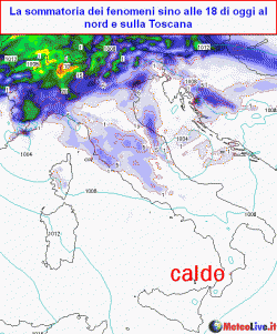 OGGI: instabile al nord e sulla Toscana con rovesci anche temporaleschi, dapprima più probabili sui rilievi, poi possibili anche in pianura, colpi di vento ed isolate grandinate. Sul resto del centro irregolarmente nuvoloso ma con pochi fenomeni, semmai limitati a brevi rovesci sull’Umbria, per il resto asciutto. Al sud velature passeggere in un contesto soleggiato e caldo. Nella notte fenomeni in localizzazione su Valpadana e Sardegna.