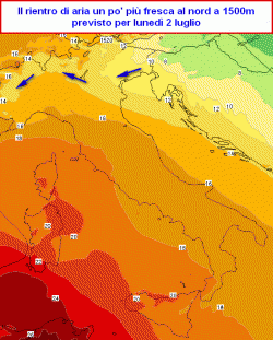 ARIA MENO CALDA: si insinuerà sul settentrione da est nella notte su lunedì sottoforma di venti orientali, favorendo un modesto ridimensionamento delle temperature.