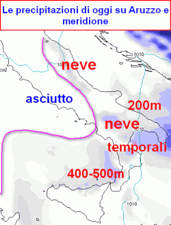 NEVICATE: sino a sera possibili nevicate sino in pianura su Abruzzo e Molise, in Puglia sino a 150m, ma con fiocchi svolazzanti possibili anche sul litorale, neve sino a 200m in Basilicata, sino a 300m in Calabria e 400-500m su nord Sicilia. Possibili temporali nevosi.