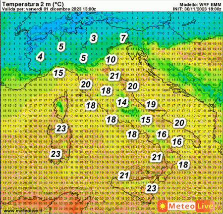 In Pianura Padana FREDDO, con valori massimi prossimi ai 4-5°. Sul resto d’Italia MITEZZA ESASPERATA con punte di 23° in Sardegna ed in Sicilia, ma 20-21° saranno probabili su molte aree.