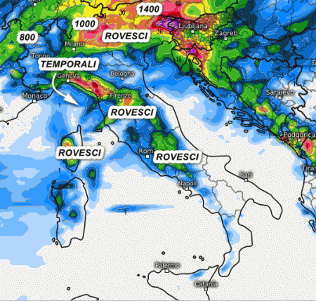 L’arrivo di aria molto fredda in quota (circa –25° a 5000 metri) potrebbe innescare temporali nelle ore centrali della giornata che dal basso Piemonte si porteranno sulla Liguria. Possibili fenomeni di grandine. Quota neve in calo sulle Alpi occidentali fino a 800 metri in Val d’Aosta. Rovesci di pioggia al centro e sul nord-est con quota neve qui ancora elevata, attorno a 1400-1500 metri. Su tutte le altre regioni tempo asciutto a parte piovaschi sulla Sardegna e sulla Campania. Molto mite al centro e al sud, più freddo al nord. Ventoso ovunque e mari in cattive condizioni.