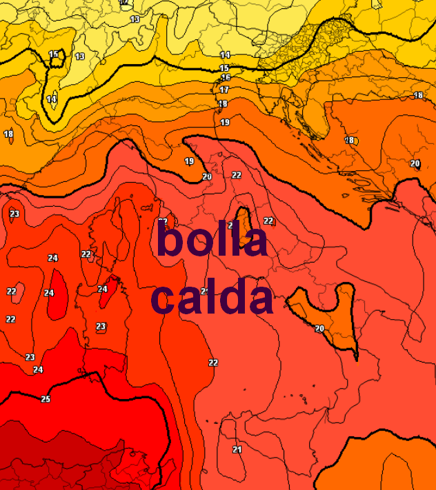 Nei giorni successivi ecco la rimonta anticiclonica con bel tempo estivo quasi ovunque, salvo qualche temporale nelle Alpi tra il pomeriggio e la sera. La massa d’aria calda in risalita da sud ovest sarà possente con punte di 23°C a 1500m e di oltre 35°C al suolo, specie sulle isole maggiori e sul medio Adriatico per ricaduta favonica, come vediamo da questa mappa: