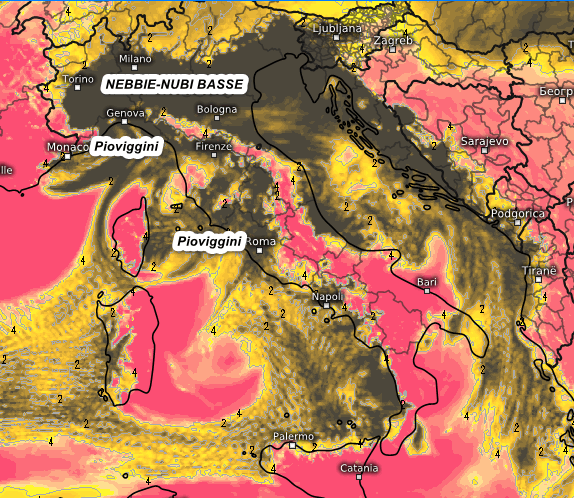 Questa volta i massimi pressori saranno più a sud, di conseguenza la nostra Penisola verrà investita da aria molto mite, ma anche umida. Da ciò scaturiranno nebbie e nubi basse che tingeranno di grigio vaste porzioni del cielo italico, sia a Natale che a Santo Stefano.