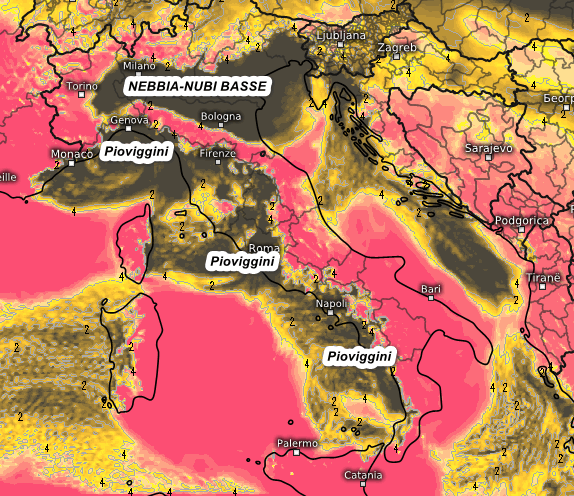 Situazione invariata…anzi, le nubi basse potrebbero interessare anche alcuni settori del versante adriatico e la Sicilia settentrionale. Temperature miti al centro e al sud, più fredde sulle pianure del nord in corrispondenza delle situazioni nebbiose.