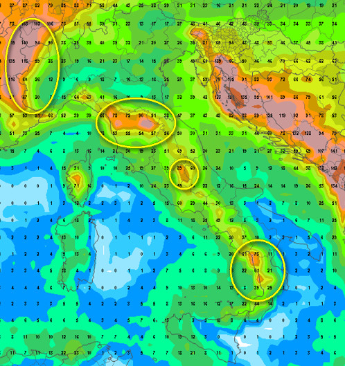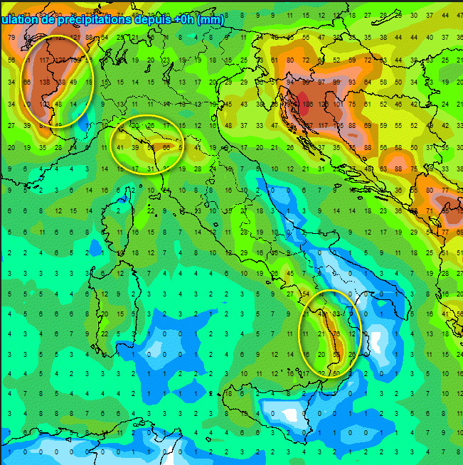 La prima mappa mostra la sommatoria delle piogge attese in Italia fino a giovedi 28 novembre secondo il modello GFS. I numeri che vedete sulla mappa sono i millimetri di pioggia previsti: non devono essere presi come oro colato, ma indicano solo le aree maggiormente esposte ai fenomeni:
