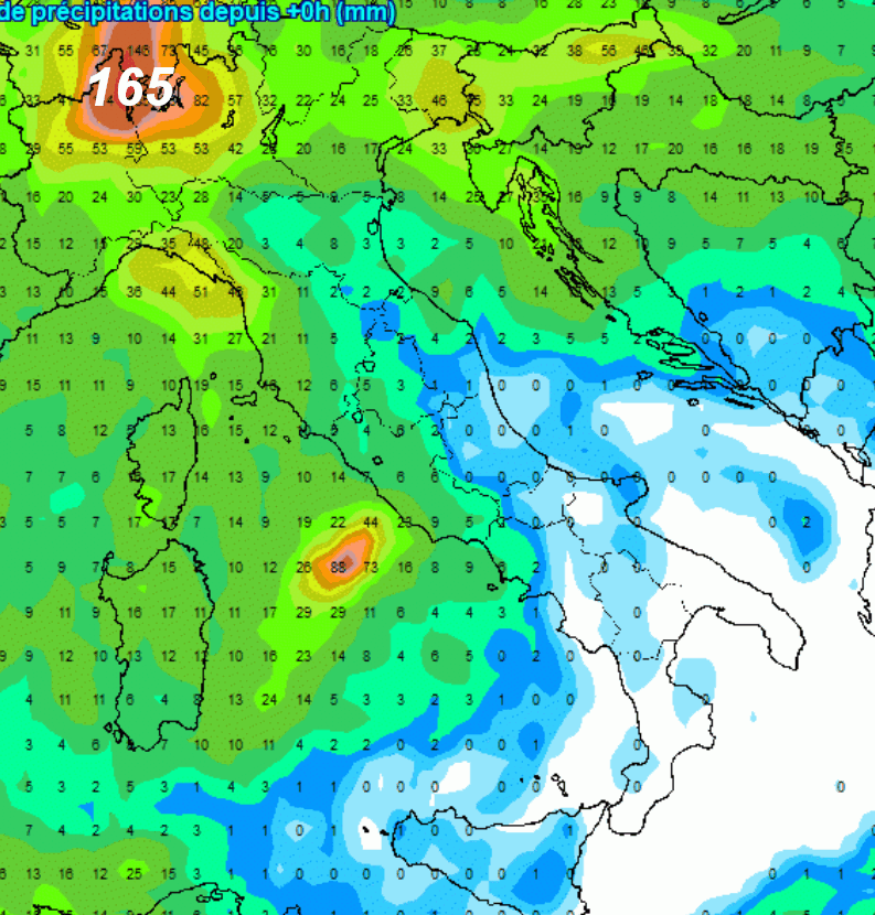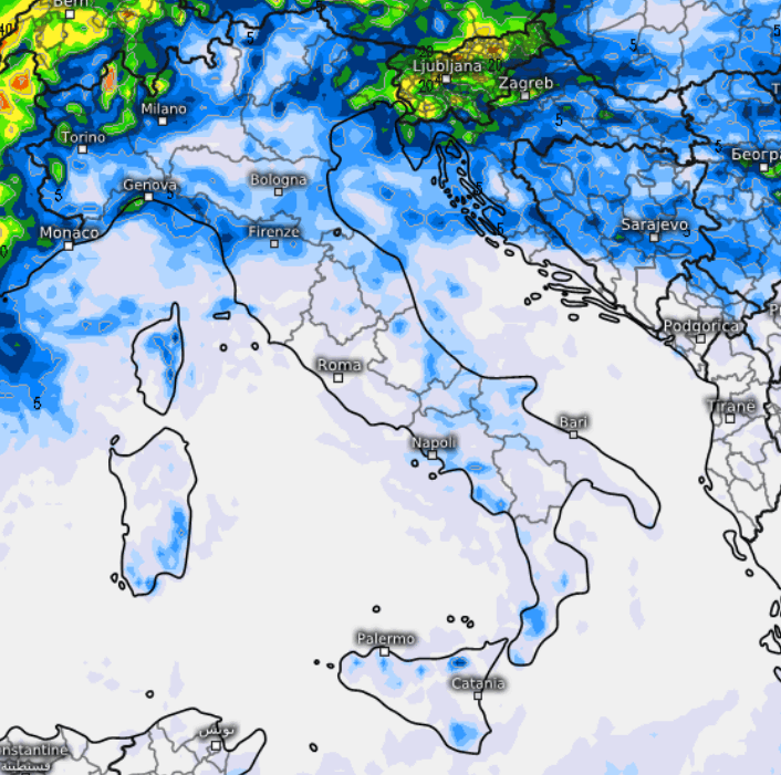 Notiamo un buon carico di pioggia in arrivo al nord, sulla Sardegna e sul medio-alto Tirreno, in accordo con l’ingresso di una perturbazione atlantica su queste regioni. Resterebbero ancora a secco le aree del medio Adriatico e il Meridione, ad eccezione forse della Campania. Da notare un massimo piovoso importante previsto tra l’alto Piemonte e l’alta Lombardia.