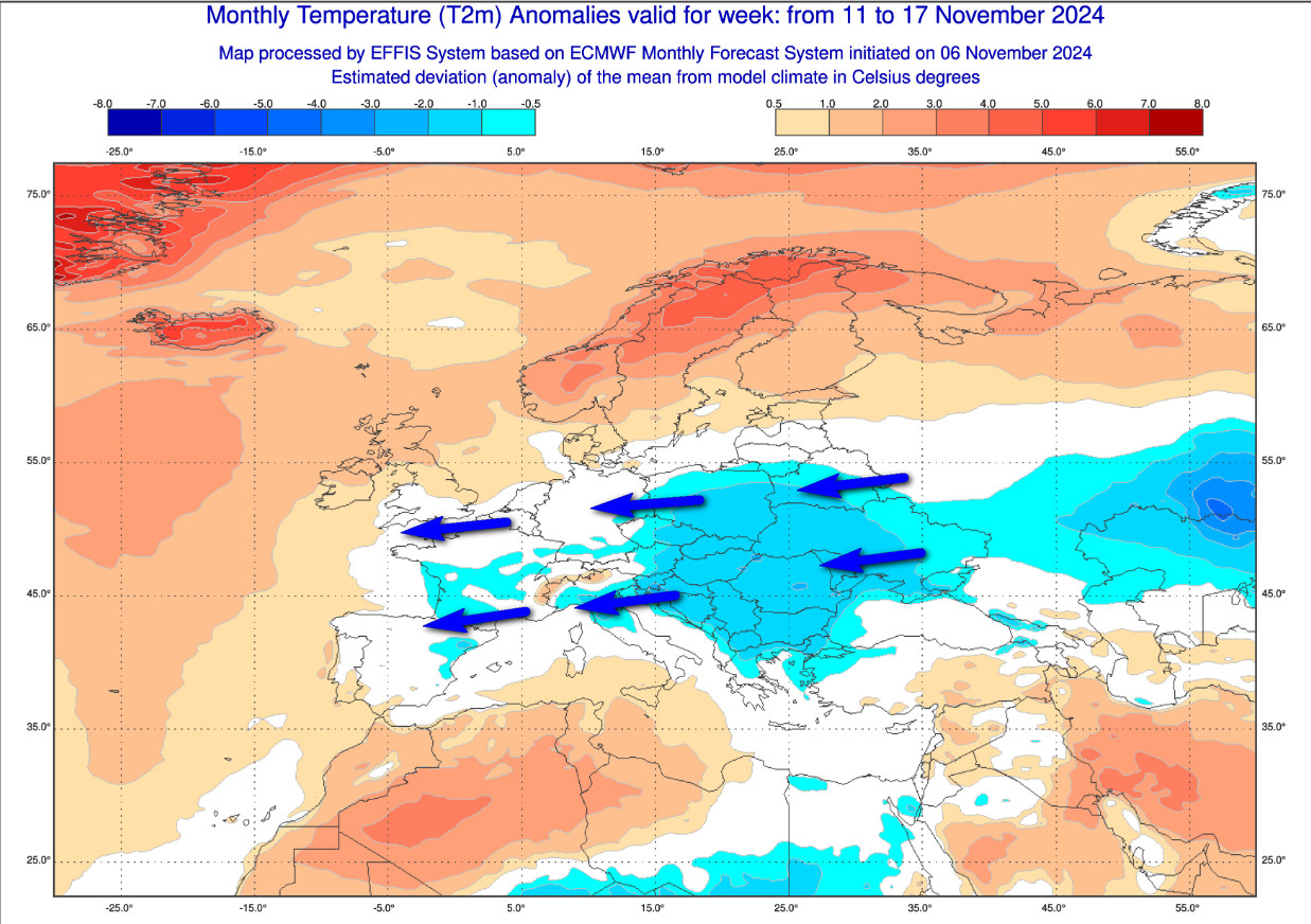 Osservate la MITEZZA IMPIETOSA che interesserà l’Europa occidentale e settentrionale con valori termici di molto superiori alla media. Osservate però l’altrettanto vasto lago freddo che comanderà la scena sull’Europa orientale fino ad arrivare al Mar Nero. Il freddo si metterà in moto verso occidente e nell’arco della settimana prossima dovrebbe spazzare via il clima mite dall’Europa centrale e dall’Italia.