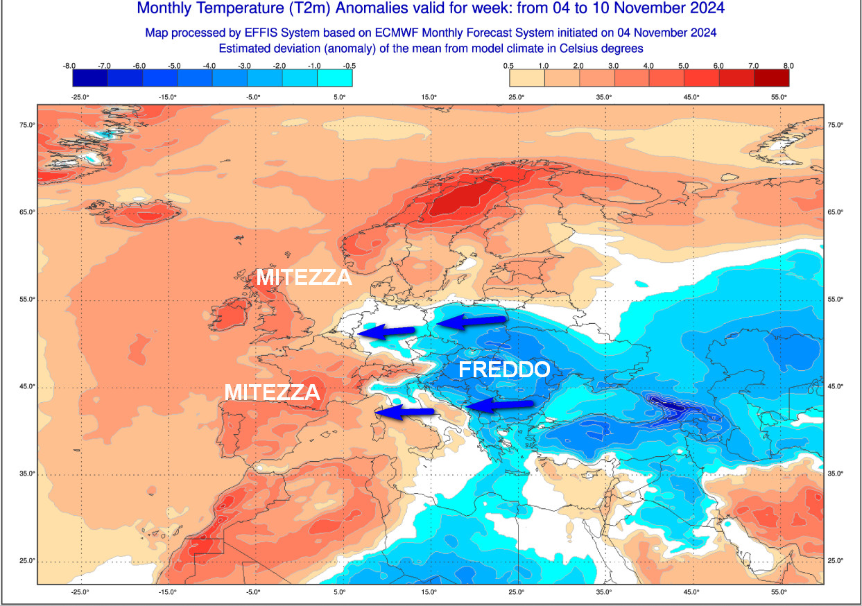 Questa volta il FREDDO potrebbe sconfiggere la mitezza imperante su parte del nostro Continente. La prima mappa mostra le anomalie termiche al suolo attese in Europa fino a domenica 10 novembre: