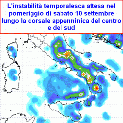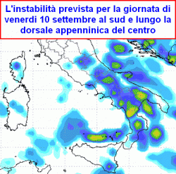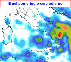 OGGI: sulle regioni joniche, tempo a tratti anche perturbato con piogge e temporali, sul resto del sud nuvolosità irregolare, a tratti intensa con possibili temporali sparsi o rovesci di pioggia; instabile anche sul medio Adriatico, specie sull’Abruzzo, con brevi temporali, specie nel pomeriggio; un po’ di instabilità anche sul Lazio interno e sul Pontino, nonché sulla Sardegna orientale con locali spunti temporaleschi, tempo migliore altrove, in rasserenamento al nord. Temperature in lieve aumento al nord, stazionarie altrove. Ancora vento al centro e al sud, un po’ di vento da est nei bassi strati al settentrione.