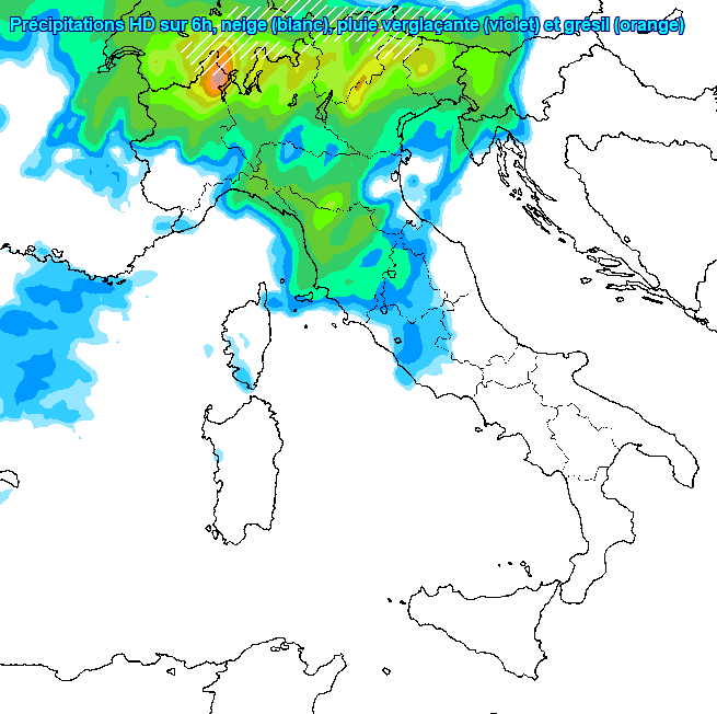 La parentesi calda durerà anche a Pasqua e terminerà nel corso di Pasquetta, ma il nord non se ne accorgerà, perché qui il modello americano prevede altre piogge in transito da ovest verso est, come vedete in questa mappa per Pasquetta, che coinvolge nei rovesci anche la Toscana: