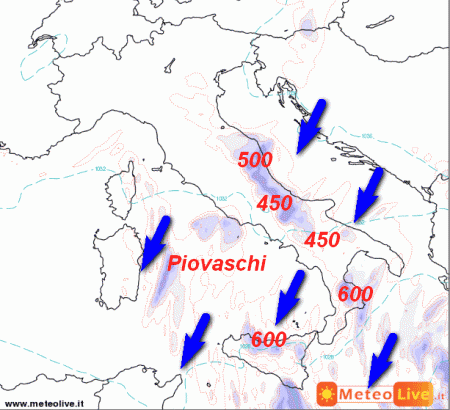 La prima mappa mostra la sommatoria delle precipitazioni attese oggi sul nostro Paese: