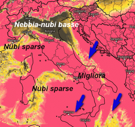 Situazione in miglioramento sul medio Adriatico e al meridione dove permarranno però venti ancora sostenuti da nord-est. Un po’ di nubi sparse tra Liguria, Corsica e Sardegna senza pioggia, tanta nebbia o nubi basse in pianura padana con qualità dell’aria pessima.