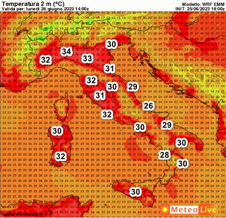 Condizioni di caldo in genere moderato su tutta l’Italia. Segnaliamo 33-34° in Valpadana.