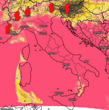 La seconda mappa mostra il soleggiamento totale cumulato previsto tra le 9 e le 16 di lunedi 26 giugno (rosa molto soleggiato, giallo nubi e schiarite, grigio scuro assenza di sole)