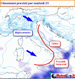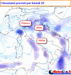 Emilia, spartiacque appenninico toscano, ma con possibili episodi misti ad acqua fin sulla Romagna, a quote poste tra 800 e 1000 metri sulle altre regioni. Martedì qualche spruzzata fin verso i 600 metri sulle Marche, sempre oltre i 1000 metri sul resto del centro. oltre i 1300 metri al sud.