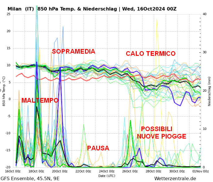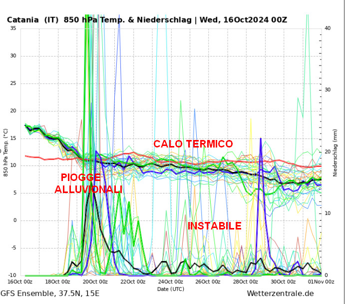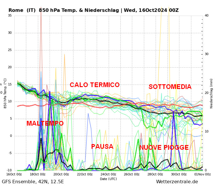 Quelli che vedete sono chiamati “spaghetti” e riassumono tutte le corse del modello, compresa ovviamente quella ufficiale. La corsa ufficiale è rappresentata dalla linea verde. Le linee a metà grafico sono le temperature a 1500 metri di quota e la linea rossa è la media. I picchi che si notano più in basso sono invece le precipitazioni. Più i valori sono alti, più le piogge (o le nevicate) sono probabili e intense. I punti geografici di riferimento sono situati sulla verticale delle città di MILANO, ROMA e CATANIA.