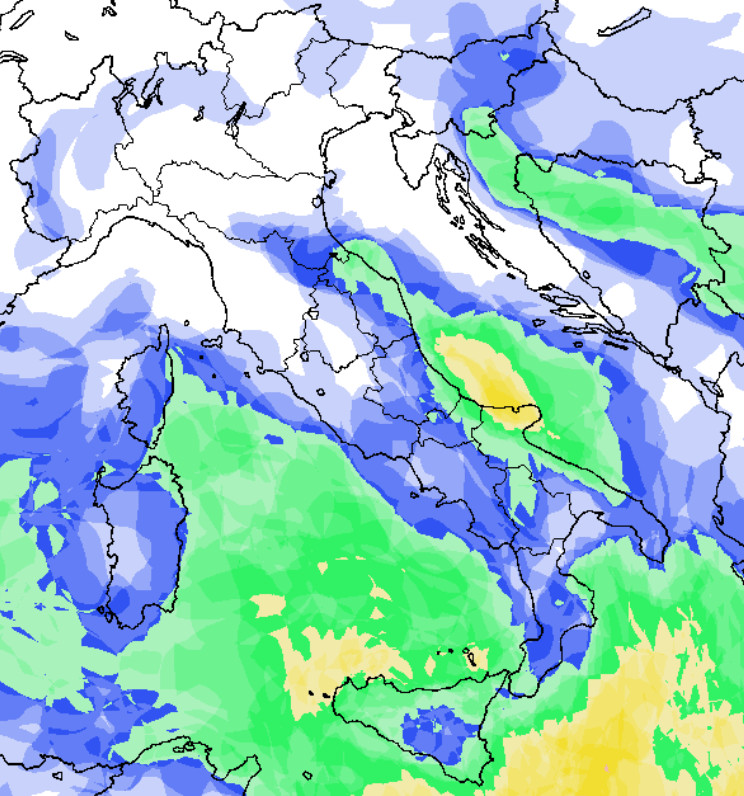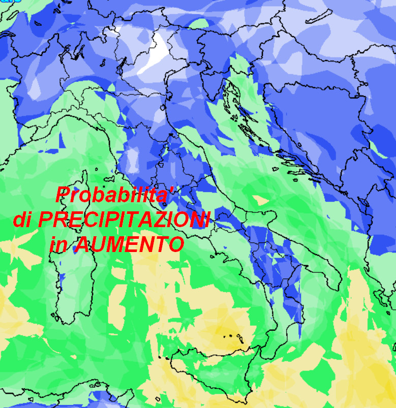 Notiamo un aumento della probabilità di piogge e/o nevicate in Italia durante il periodo suddetto, anche se vi saranno ancora zone con una probabilità di precipitazioni bassa, ma non del tutto assente.